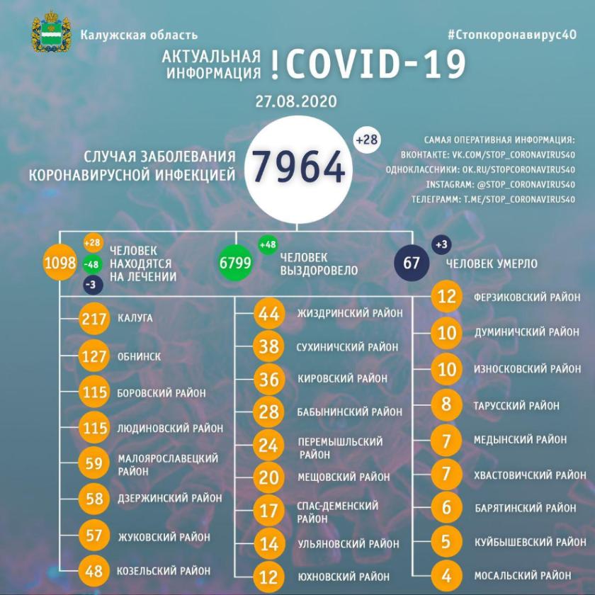Сейчас Калуге и районах от новой инфекции проходят лечение 1098 человек, из больниц в последние сутки выписаны 48 пациентов.