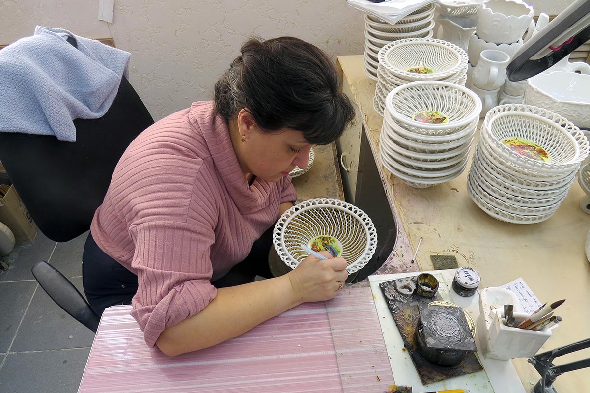 Изделия отправляют на обжиг, глазируют. Керамика приобретает бело-молочный цвет. И снова обжиг. А затем настает очередь художников – они расписывают сухарницы золотом, покрывают кобальтом, люстром, клеят на донышко специальную переводную картинку – деколь. Чтобы краски закрепились, сухарницы снова обжигают в печи. С помощью трех стадий обжига мастера добиваются долговечности, прочности и устойчивости фарфора к внешним воздействиям.