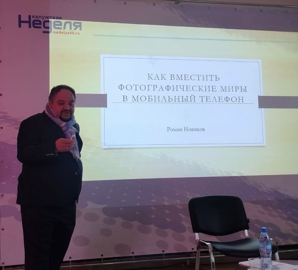 Следующим спикером стал автор телеграм-канала «Калужский иллюзион», победитель калужского городского конкурса в номинации «Мобильная фотография. Архитектура города Калуги» Роман Новиков. Он рассказал о своём взгляде на мир фотографии, а также принципах своей фотодеятельности. Роман Новиков призвал присутствующих замечать окружающую атмосферу и стараться передать ее на своих снимках.