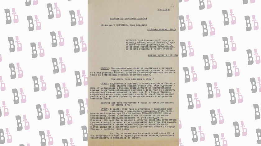 В январе 1944 года советскими органами безопасности был задержан следователь «команды СД» в гор. Сталино Юрий Щербаков. На допросе он показал, что «находившаяся в гор. Сталино команда СД и „вспомогательная служба“ при ней, официально именовавшаяся „Служба безопасности и СД“ на генеральный округ Сталино, имевшая свои отделения во всех крупных промышленных пунктах Донбасса, занималась массовым и методическим истреблением советского народа, действуя по приказам гитлеровского правительства...