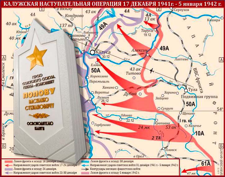 Василий Степанович Попов (1893 - 1967) — советский военачальник, командующий 10-й и 70-й армиями, генерал-полковник, Герой Советского Союза. В декабре 1941-го для глубокого прорыва на тыловые коммуникации противника была создана специальная подвижная группа под командованием тогда еще генерал-майора Попова, которой предстояло совершить 90-километровый рейд и внезапным ударом овладеть Калугой. Операция началась в ночь с 17 на 18 декабря 1941-го. В 5 часов утра 21 декабря советские войска устремились к городу. Завязались ожесточенные бои, грозившие полным разгромом подвижной группы. Но к 23 декабря к Калуге подошли основные силы 50-й армии, а 30 декабря город был освобожден.