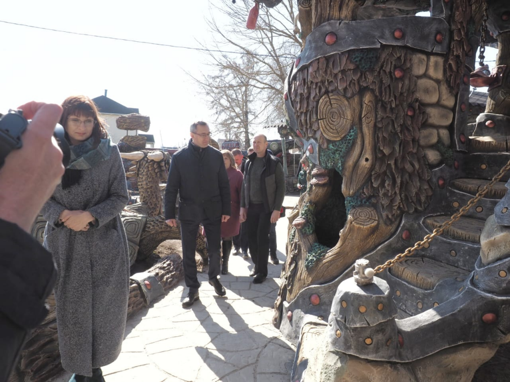 Делегация побывала и в сказочном доме на подворье Вихляндия, осмотрели площадки, входящие в туристическую концепцию этого объекта, руководитель области пообщался с владельцем Владимиром Вихлянцевым.