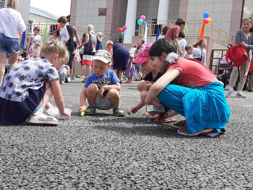 Но главное, конечно же, традиционный конкурс детского рисунка на асфальте. Ребятам раздали мелки, и творческий процесс начался. И вот уже, проходя по площади, можно увидеть гвоздику и слово «мир», милого котенка и подпись «Привет!», огромную нарисованную гитару и под ней фразу «Музыка вдохновляет». А вот и дорогой сердцу «триколор». Какие же разные наши дети! Сколько чувств и мыслей постарались они выразить в своих рисунках на асфальте.