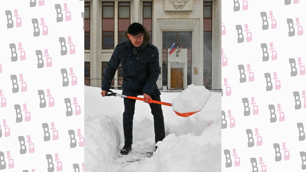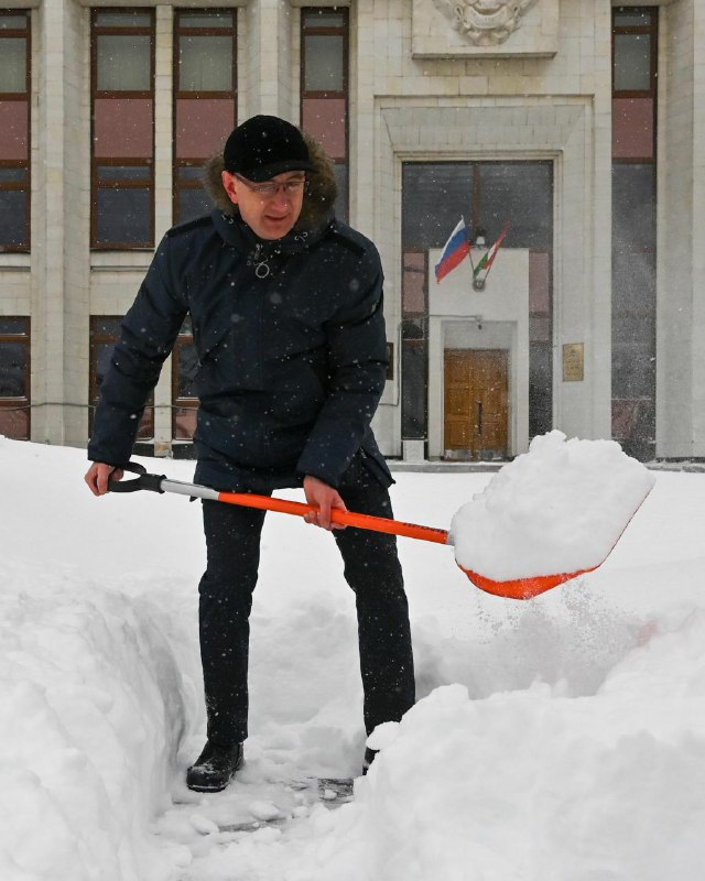 Сам Владислав Шапша выложил снимок, где он расчищает вход к зданию областной администрации.