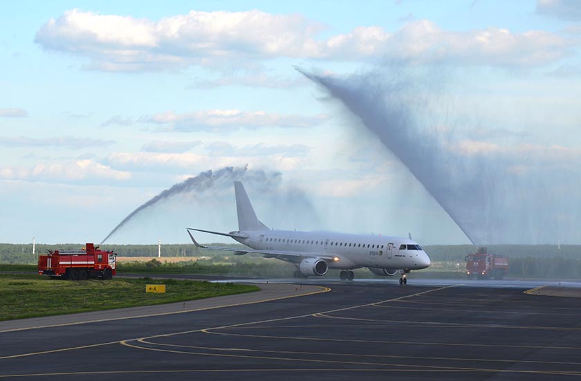 Первый рейс нового перевозчика прибыл на Калужскую землю из Симферополя. По доброй традиции его встретили водяной аркой. После дозаправки и приема пассажиров на борт 110-местный Embraer E190 снова поднялся в небо и взял курс на Сочи.