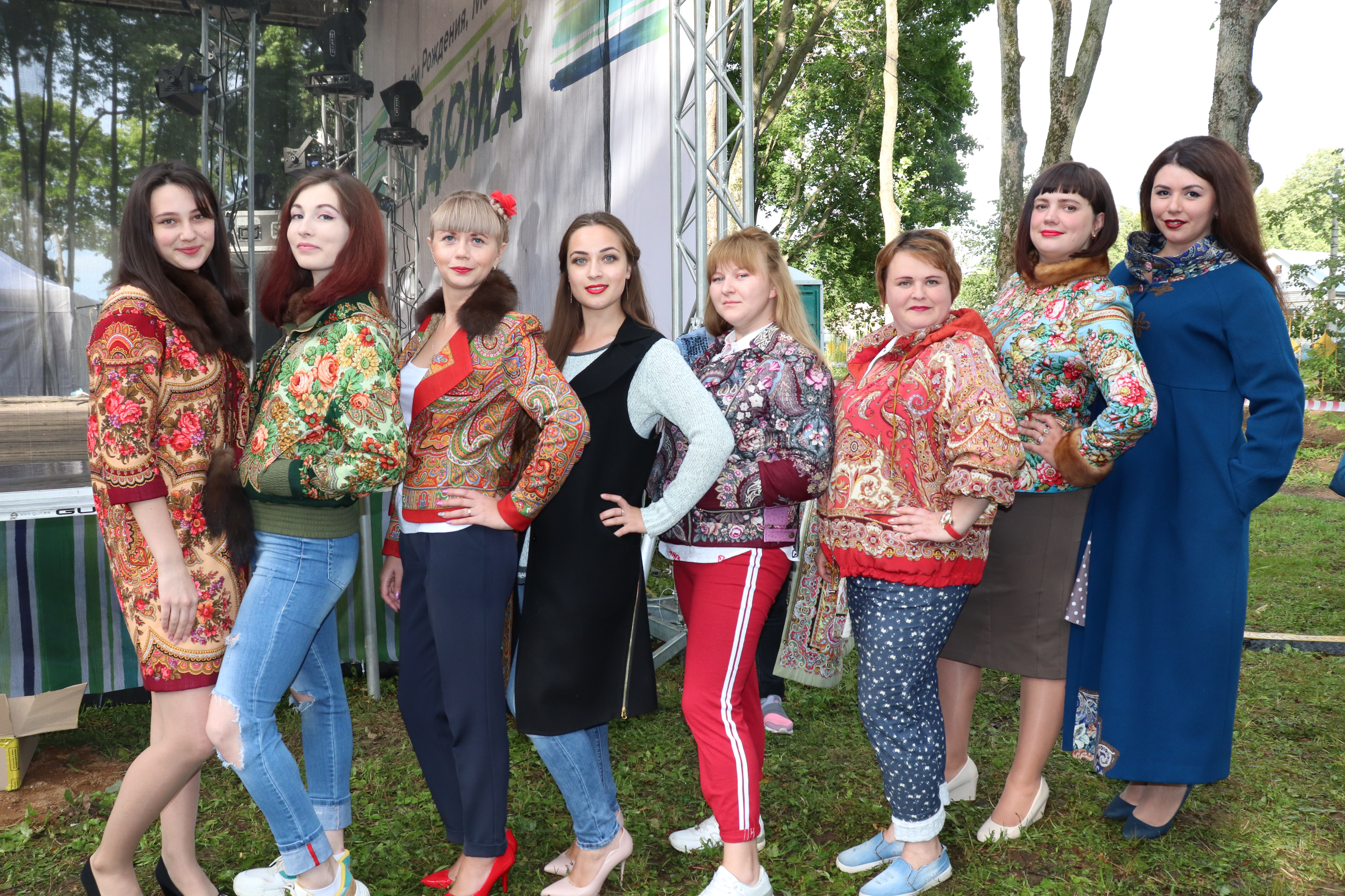 Восемь мещовских девушек - Ирина Савкина, Алевтина Шилова, Полина Никонова, Екатерина Фартукова, Елена Иванова, Екатерина Моськина, Карина Новикова, Елена Кулькова, - сменяя друг друга, демонстрировали удивительную по красоте одежду. Как женственно и элегантно смотрелись они в ней! Нам, зрителям, издалека казалось, что это живые розы упали на плечи наших красавиц, а на красном и чёрном фоне, как по полю, рассыпались цветочные гирлянды. Это придавало каждому модному и стильному образу неповторимую самобытность, народные нотки.Вот что рассказывали после окончания дефиле сами модели.