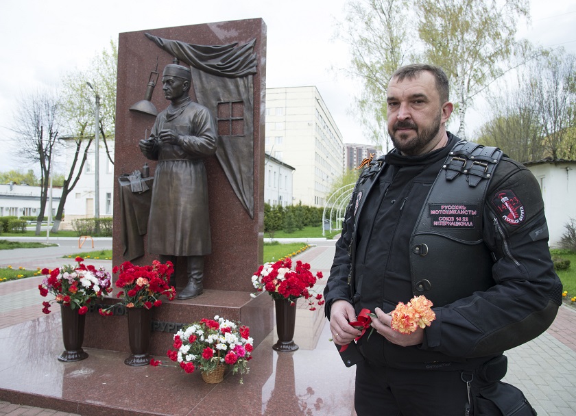 В ходе мотомарша, по дороге в Москву, Александр Елисеев посетил Калугу. От дома в немецком Вегберге до нашего города он уже преодолел 2543 километра. У нас было, что показать гостю из Германии. Русский мотоциклист возложил цветы к Вечному Огню на площади Победы. Побывал у памятника маршалу Советского Союза Г. К. Жукову и в сквере Защитников Отечества, у памятника воинам-интернационалистам – это было очень символично, только что всей страной мы отметили 77-ю годовщину окончания Великой Отечественной войны. А после, зная о его существовании, попросил показать ему памятник военному хирургу. И, конечно, из специального пенала, укрепленного на мотоцикле, была распакована копия реликвии, где на двух языках – немецком и русском говорится о смелом и таком человечном поступке простого советского солдата.
