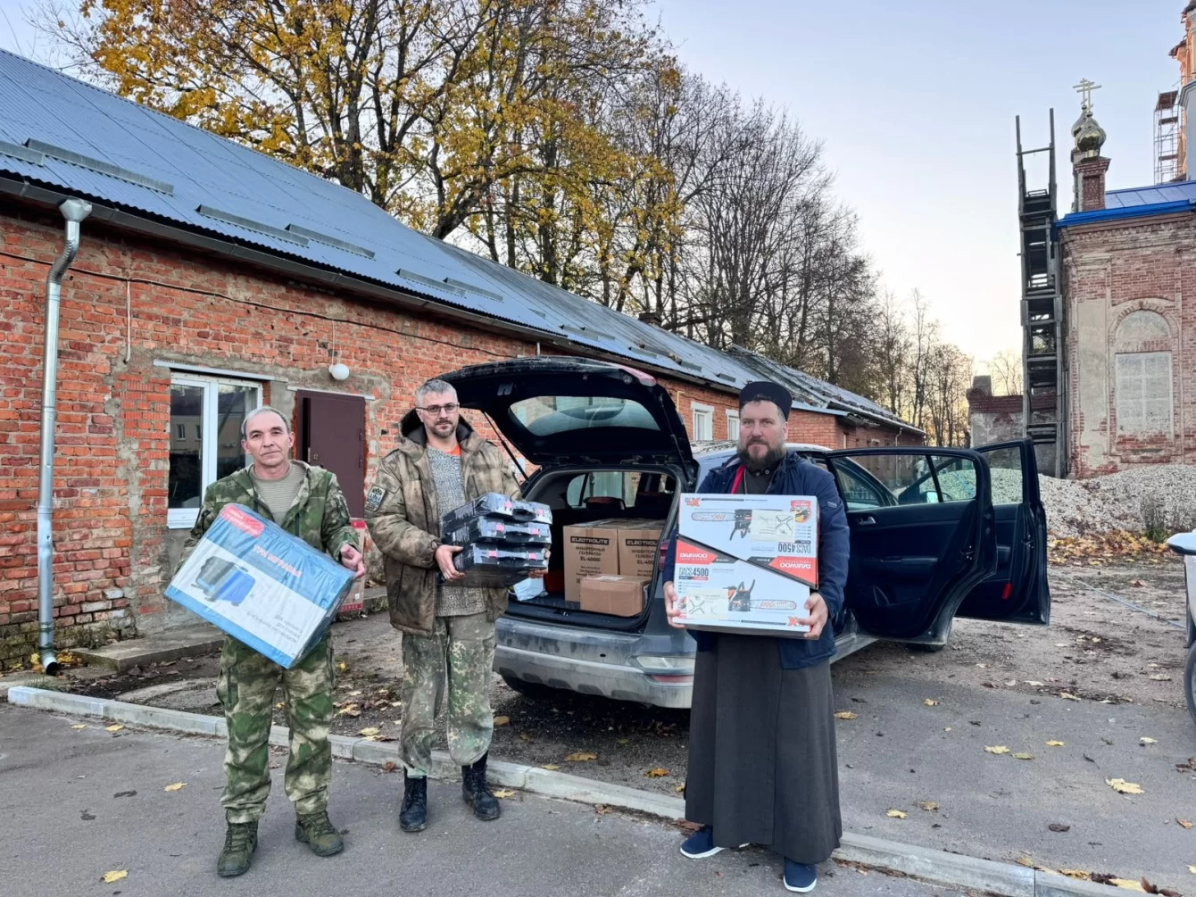 На двух автомобилях повезли большой заказ, который ранее поступил от бойцов. В состав груза вошли тепловизоры, генераторы, газовые плиты, бензопилы. В храме прихожанки сплели четыре масксети.