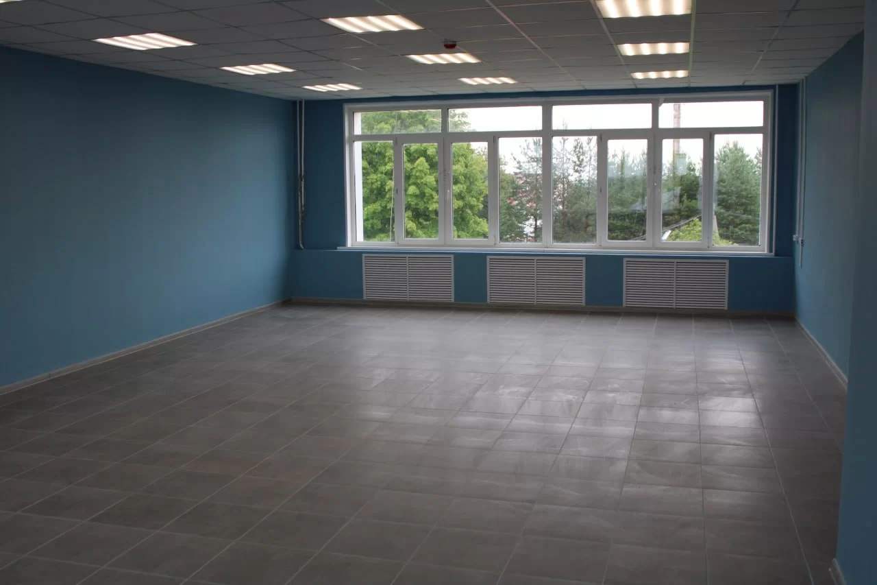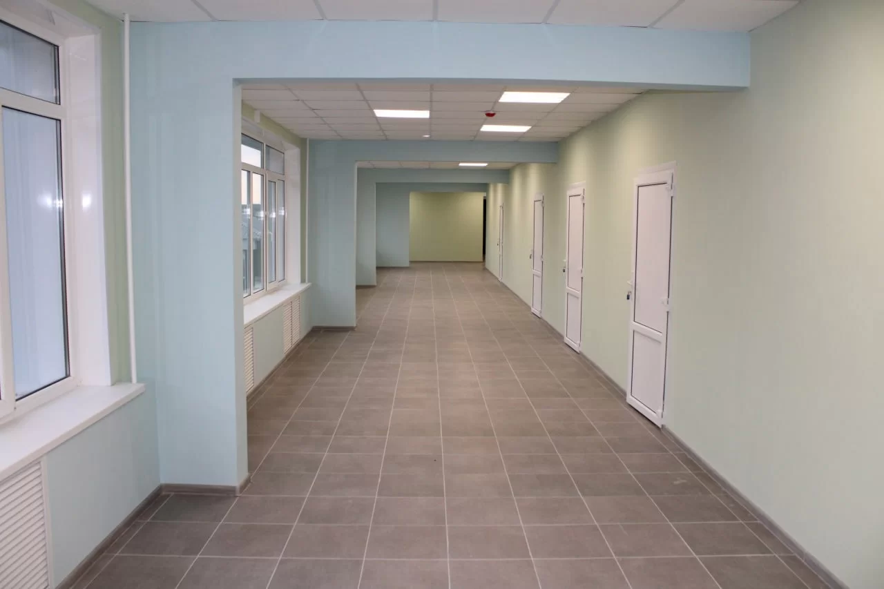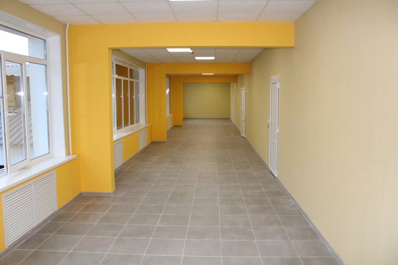 Помимо планового обновления внутренних систем, подрядчик также возвел новые перегородки, оштукатурил и покрасил стены, уложил новое покрытие на пол, заменил двери, а также установил новые радиаторы отопления. В коридорах появились новые модульные кресла и столы, мягкие пуфы, закуплены лыжи для занятий физической культурой в зимнее время года, построена серверная.