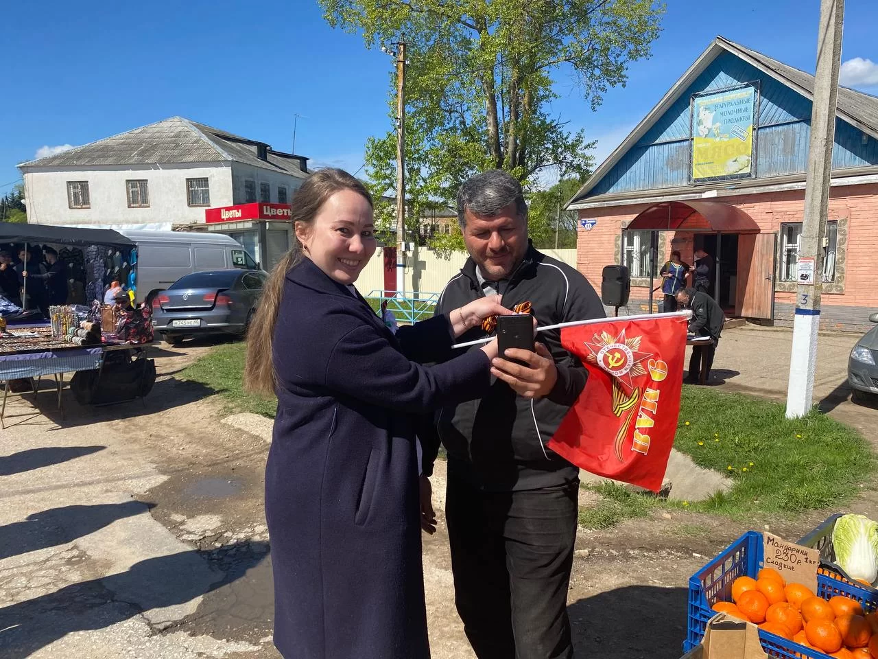 В знак памяти и уважения к ветеранам, сражавшимся за Отечество, сельчане прикрепляли символизирующие связь поколений ленты на грудь и подпевали выступающим.