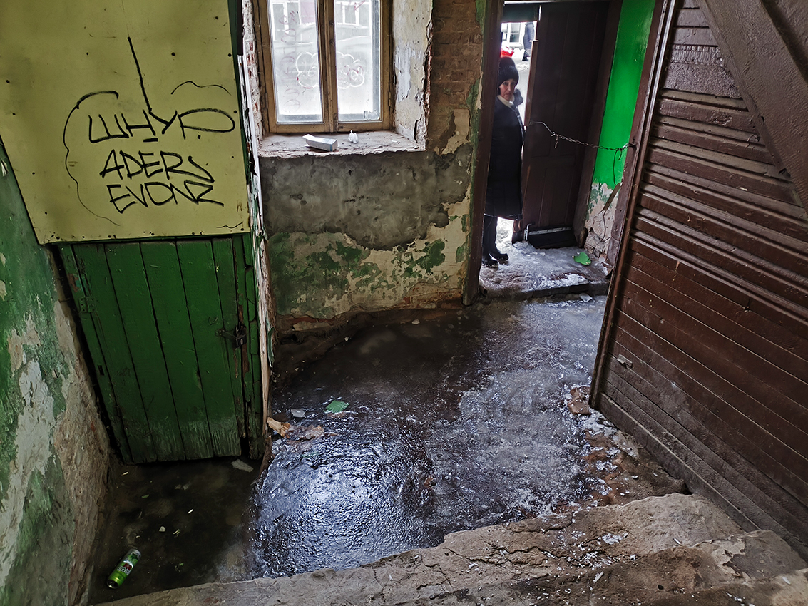 Помимо льда над головой жильцы дома жалуются и на лед под ногами. Дело в том, что в морозное время пол в подъезде на первом этаже превращается в каток, а во время оттепели там плещется вода.
