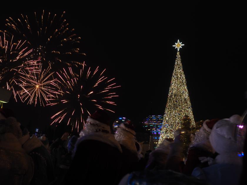 Сейчас на площади при многочисленном стечении зрителей проходит праздничный концерт и уже отгремел фейерверк. Но сначала, как и положено, зажглась главная новогодняя ёлка.