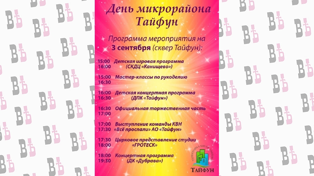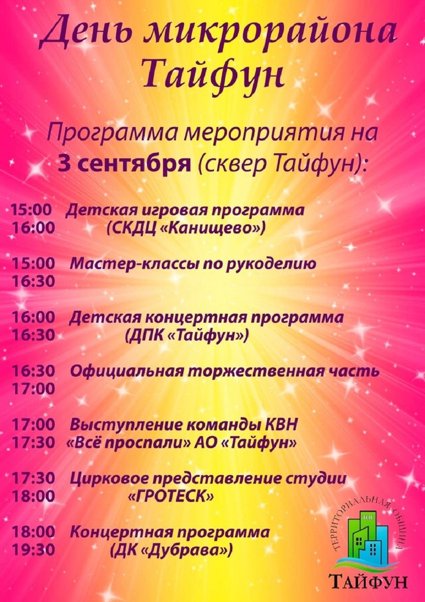 В 15:00 на территории проведения праздника начнутся мастер-классы по рукоделию. В 16:30 состоится награждение активистов территориальной общины «Тайфун» и далее детская концертная программа. В 17:00 на сцене появится местная команда КВН, а в 17:30 начнётся цирковое представление.