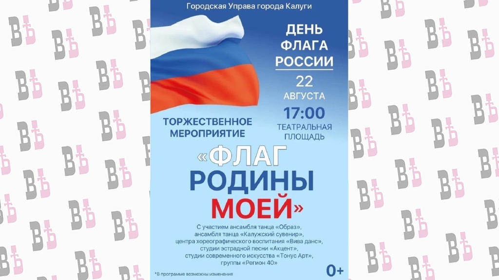 Мероприятие «Флаг Родины моей» начнётся в 17:00. Вход свободный. Творческие выступления для гостей и калужан покажут танцевальные ансамбли «Образ» и «Калужский сувенир», центр хореографического воспитания «Вива данс», студия эстрадной песни «Акцент», студия современного искусства «Тонус Арт» и группа «Регион 40».