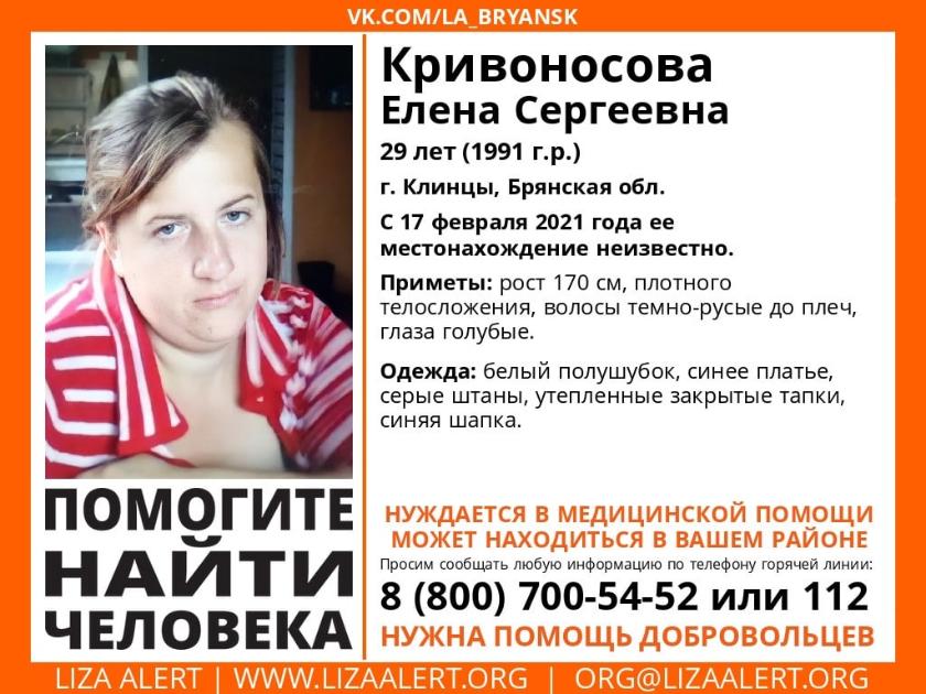 29-летняя жительница Брянской области Елена Сергеевна Кривоносова пропала трое суток назад.