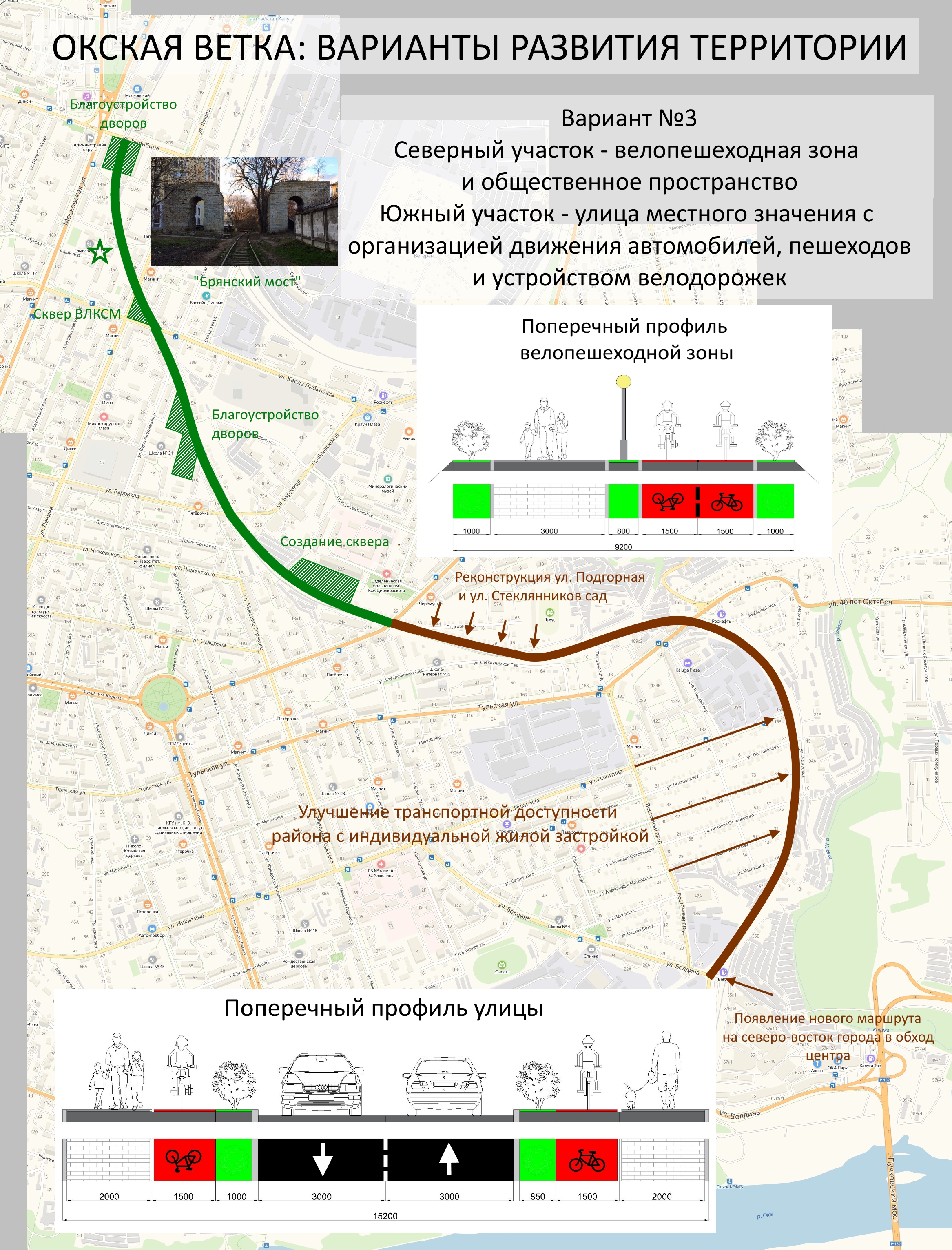В третьем варианте проектировщики совместили два предыдущих проекта и предусмотрели реконструкцию неиспользуемой железнодорожной линии на участке от улицы Билибина до улицы Маршала Жукова в пешеходную зону и общественное пространство, а на участке от улицы Маршала Жукова до улицы Болдина в улицу местного значения с организацией движения автомобилей, пешеходов и с устройством велодорожек.