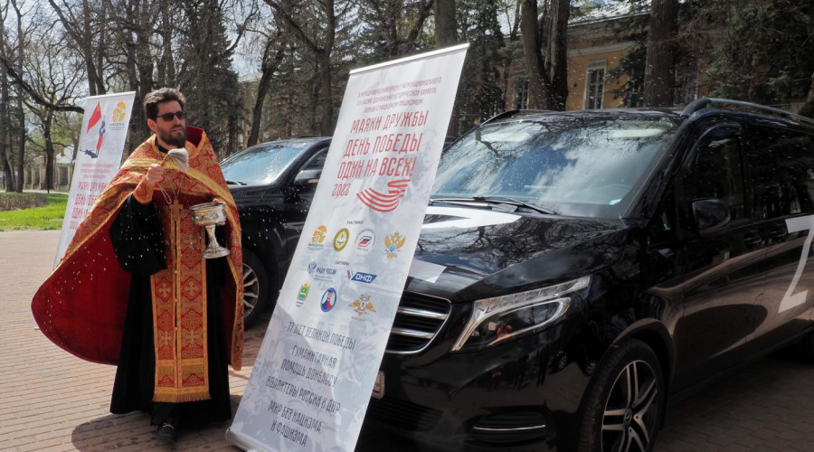 «Перед выездом в Свято-Троицком соборе Владыка Леонид отслужил молебен и передал в дар храму в Мариуполе Калужскую икону Божией Матери. После освящения машин колонна направилась в Донецк»,