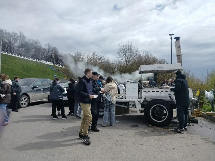 Для всех тех, кто пришел на субботник, была организована полевая кухня. Калужане могли подкрепиться гречневой кашей с тушёнкой и согреться чаем.