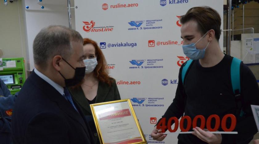 После регистрации на рейс юбилейного пассажира поздравили представители авиаперевозчика, сотрудники аэропорта и регионального Агентства по развитию туризма. Михаилу вручили подарочный сертификат на перелет для двоих по любому маршруту, обслуживаемому «РусЛайном», также калужский студент получил возможность посещать вип-зал аэропорта. ТИЦ «Калужский край» и Агентство по развитию туризма Калужской области презентовали счастливчику набор сувениров с символикой Новогодней столицы России.