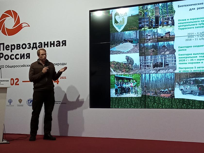 Калужские экологи рассказали о возвращении в «угорские» леса дикого лесного исполина – европейского зубра. По восстановлению среднерусской группировки зубра выступила целая группа докладчиков – Ирина Землянко от лица питомника Приокско-Террасного заповедника, откуда зубры приезжают в калужские леса, а также представители территорий, где формируются вольноживущие группировки – среди них старший научный сотрудник национального парка «Угра» Александр Рогуленко.