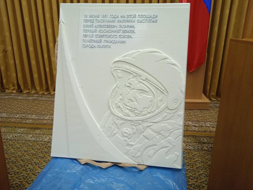 «13 июня 1961 года на этой площади перед тысячами калужан выступал Юрий Алексеевич Гагарин, первый космонавт Земли, герой Советского Союза, почетный гражданин города Калуги». В качестве материала предполагается использовать архитектурный бетон белого цвета. Он наиболее органично впишется в композицию стены Гостиного ряда.
