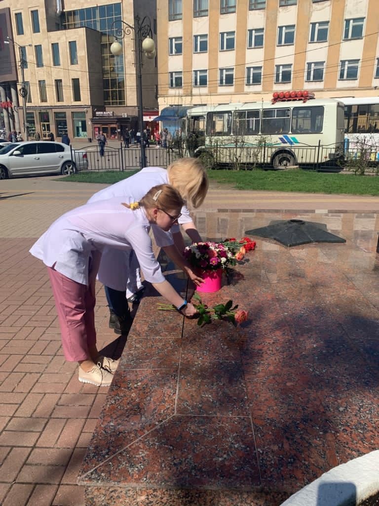 По традиции медики Калужской областной клинической больницы почтили память медработников, спасавших раненых на полях сражений Великой Отечественной войны, и возложили цветы к вечному огню у подножия стеллы.