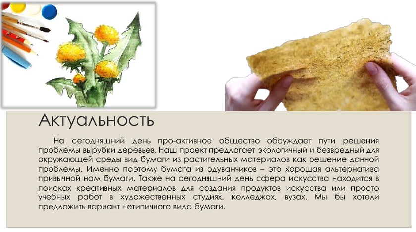 Софию Широкову волнует проблема вырубки деревьев. В качестве решения вопроса она предложила создание бумаги из одуванчиков. Такой нестандартный подход к использованию сорных растений получил спецприз в номинации «Экопроект».