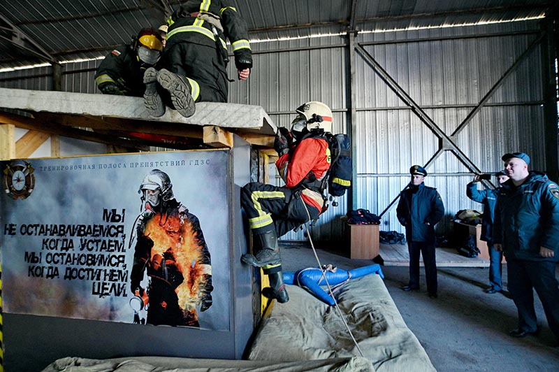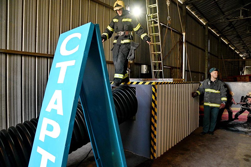 Настоящий «филиал преисподней» моделирует ситуации, с которыми газодымозащитники сталкиваются в реальных боевых условиях. Делали комплекс сами пожарные калужского гарнизона. Он должен помочь оттачивать навыки работы в сложных ситуациях, выносливость, психологическую устойчивость. Ползком, с заклеенными масками дыхательных аппаратов (на пожаре видимость практически нулевая), в амуниции, с инструментом - общий вес 25 килограммов, проходят полосу препятствий профессиональные пожарные.
