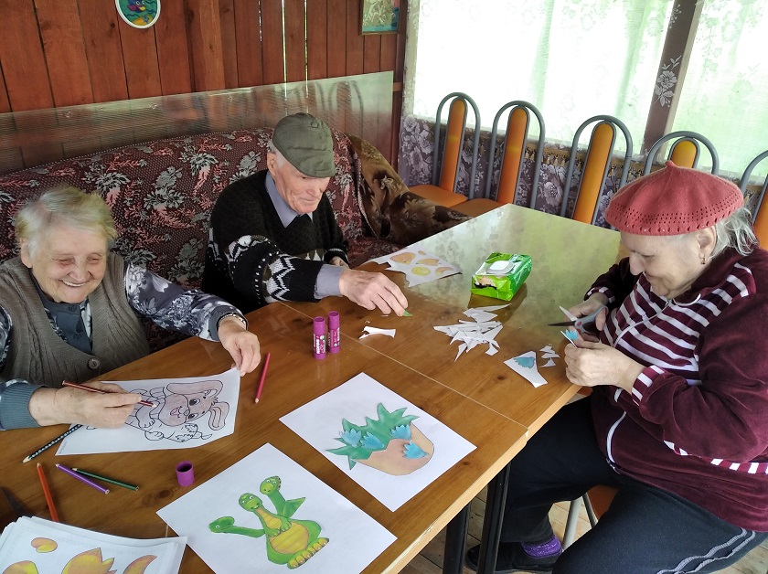 «Наши проживающие охотно выходят на арт-терапию в просторный холл, где они рисуют, разукрашивают, вырезают аппликации. Мы стараемся создать доброжелательную и дружескую атмосферу для пожилых людей», – говорит организатор и вдохновитель занятий – инструктор по трудотерапии Любовь Скрябина.