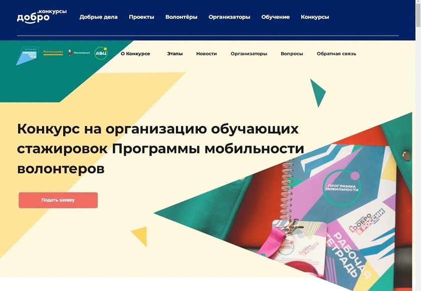 В рамках федерального проекта «Социальная активность» нацпроекта «Образование» Ассоциация волонтерских центров совместно с Федеральным агентством по делам молодежи реализуют Программу мобильности волонтеров Российской Федерации на 2019–2024 гг. и организуют конкурс на проведение обучающих стажировок для специалистов сферы добровольчества, молодежной политики и некоммерческого сектора.