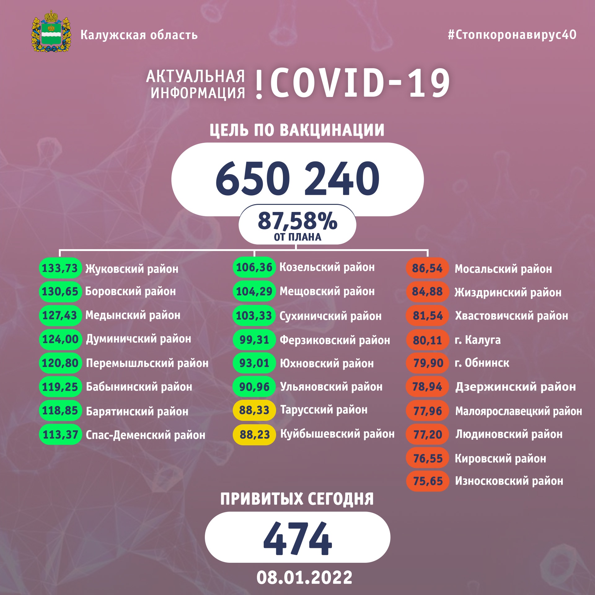 Согласно последней статистике, самыми активными темпами вакцинация идет в Жуковском и Боровском районах. Так вакцинировались более 130 процентов жителей от плана. Немного меньше – более 120 процентов, - в Медынском, Перемышльском и Думиничском районах.