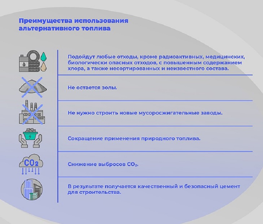 План программных мероприятий в том числе включает развитие информационно-технического справочника по наилучшим доступным технологиям «Производство цемента» и формирование инфраструктуры производства и применения альтернативного топлива в топливно-энергетическом комплексе и ЖКХ.