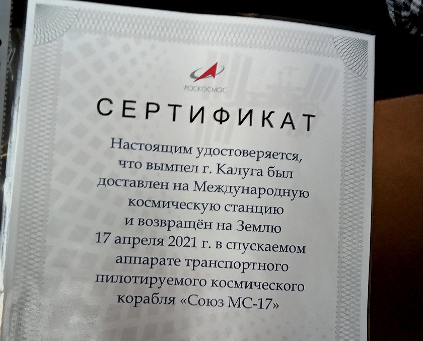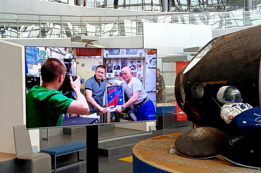 На огромном экране в этот момент был показан ролик, где космонавты, работающие на МКС, оформляют вымпелу документ с печатью. Губернатор в свою очередь передал вымпел директору Наталье Абакумовой на хранение в музей.