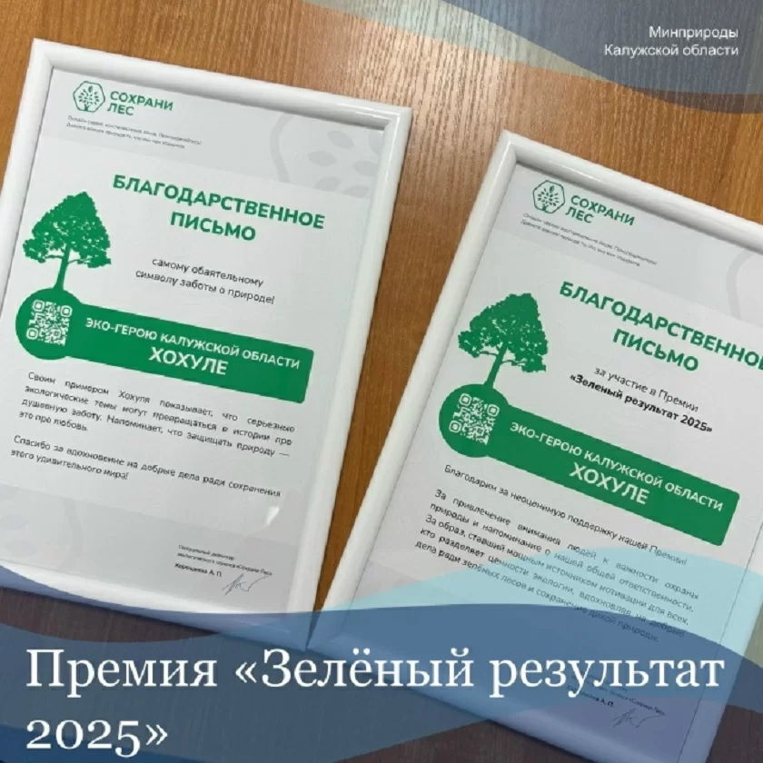 Как сообщили в региональном министерстве природных ресурсов и экологии, на церемонии вручения премии «Зелёный результат 2025» компания «Сохрани лес» наградила экологического героя Калужской области - «Хохулю».