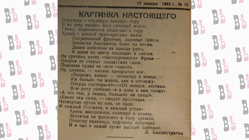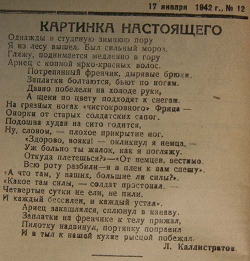Пока ничего не удалось выяснить об авторе, который подписался Л. Каллистратов. Это мог быть калужанин, свидетель освобождения города, это может быть перепечатка. Той же зимой 1942-го в одном из номеров газета опубликовала известное «Жди меня, и я вернусь» Симонова.