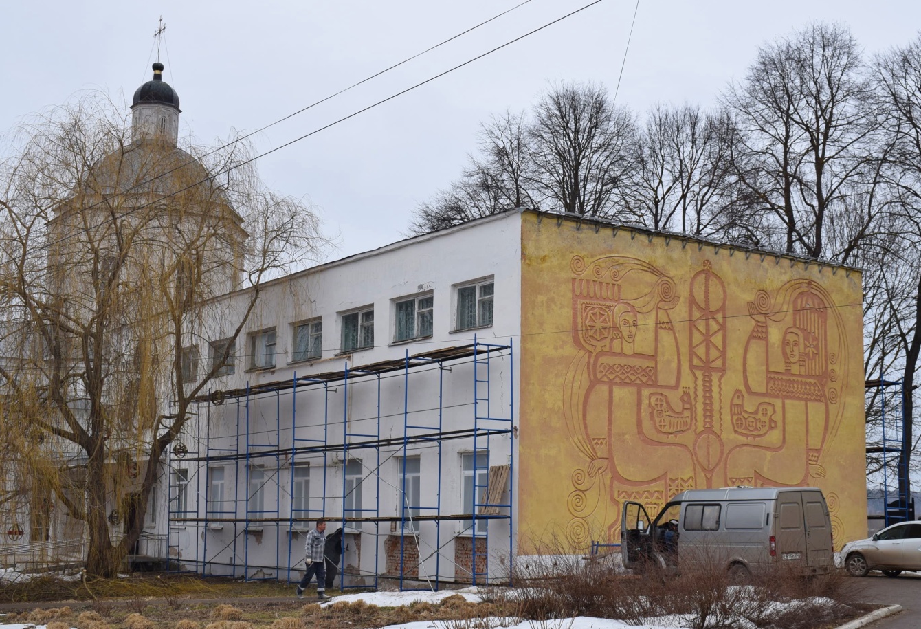 В здании отремонтируют фасад, обновят входную группу, приведут в порядок кровлю. Кроме того, на втором этаже галереи полностью заменят окна. Особое внимание уделят стене, украшенной панно-сграффито, которое называют «Тарусская вышивка» или «Пряхи», одной из достопримечательностей города. Сграффито - техника декорирования наружных стен здания, при которой на основу наносится два и более слоя кроющего материала. Потом рисунок частично процарапывается для достижения эффекта глубины.