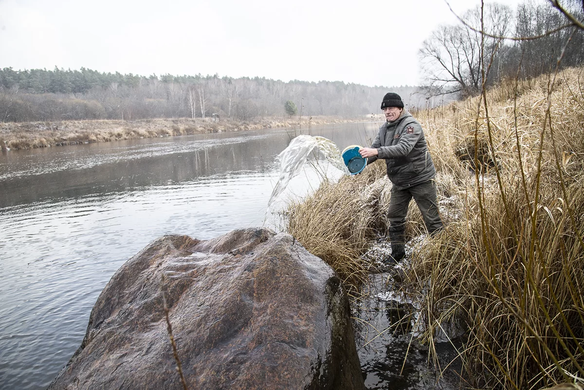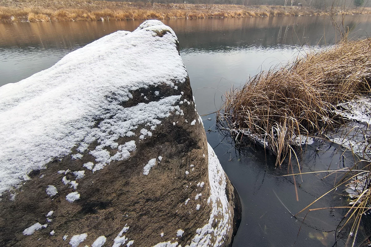 Александр Владиславович строит маршрут в навигаторе. «Буханка» переваливается в глубоких замерзших колеях. Стоп, машина! Дорогу перегородили поваленные деревья. Дальше на своих двоих. Снег сделал спуск к Угре по крутому склону похожим на слалом. Угодить с размаху в холодную речку очень не хочется. Наконец среди бурой травы мелькнул голубовато-серый лоскуток – прямо у берега над водой в снежном «берете» возвышался наш валун. Как по заказу из-за облаков вышло солнышко. Пора пускать в дело наше синее ведерко.
