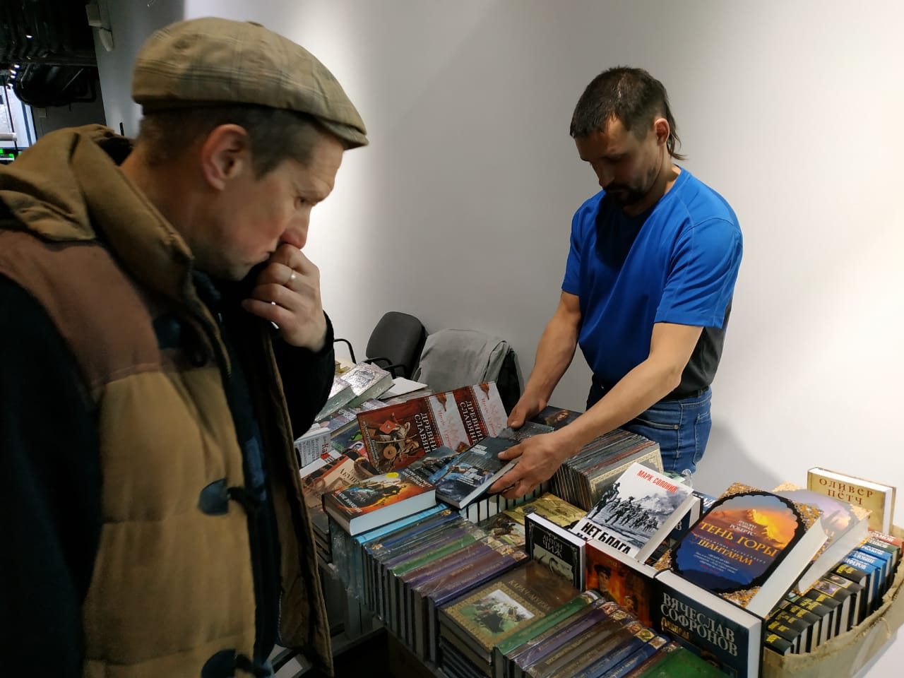 Сегодня здесь на первом этаже развернулась книжная ярмарка. Читателям предлагаются новые издания известных авторов, среди них книги писательницы Марии Семёновой - автора популярного бестселлера "Волкодав" .