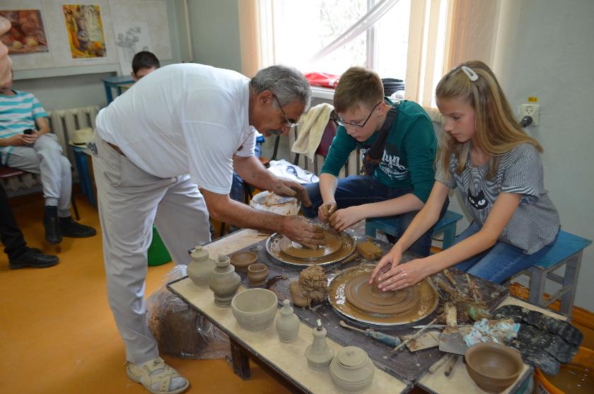 Все с интересом наблюдали за ловкими руками мастера, сделавшего за несколько минут красивый кувшин. В школу пригласили мастеров-преподавателей, которые поделятся своим опытом с учителями.
