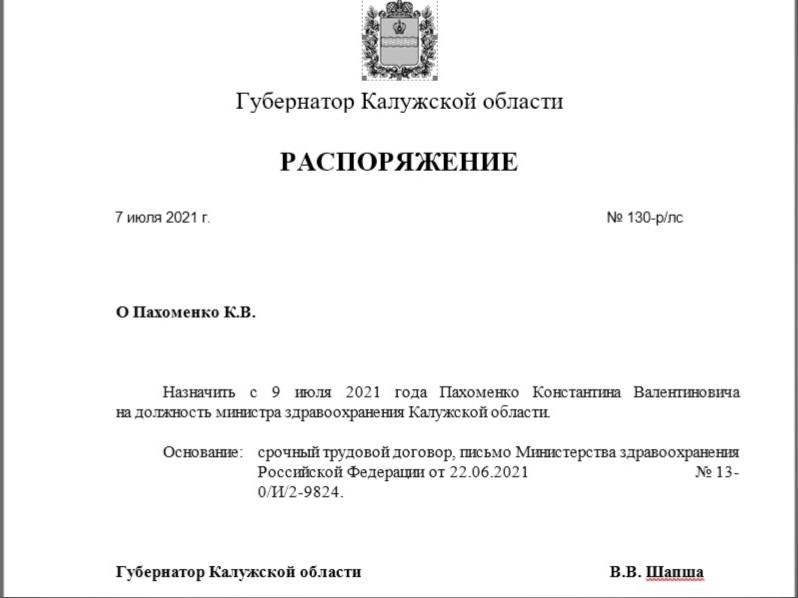Назначение подписал губернатор Калужской области Владислав Шапша в среду, 7 июля, в своем Распоряжении №130-р/лс.