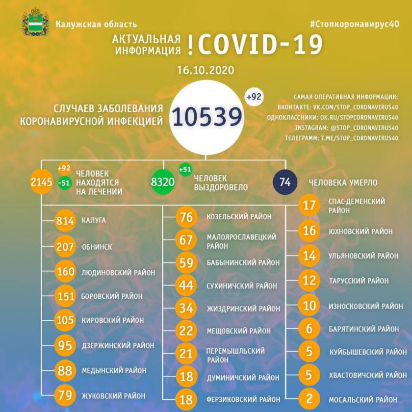 Сейчас лечение проходят 2145 калужан, инфицированных COVID-19. Более половины зараженных проживают в Калуге, Обнинске, Людиновском и Боровском районах — 52,7%.