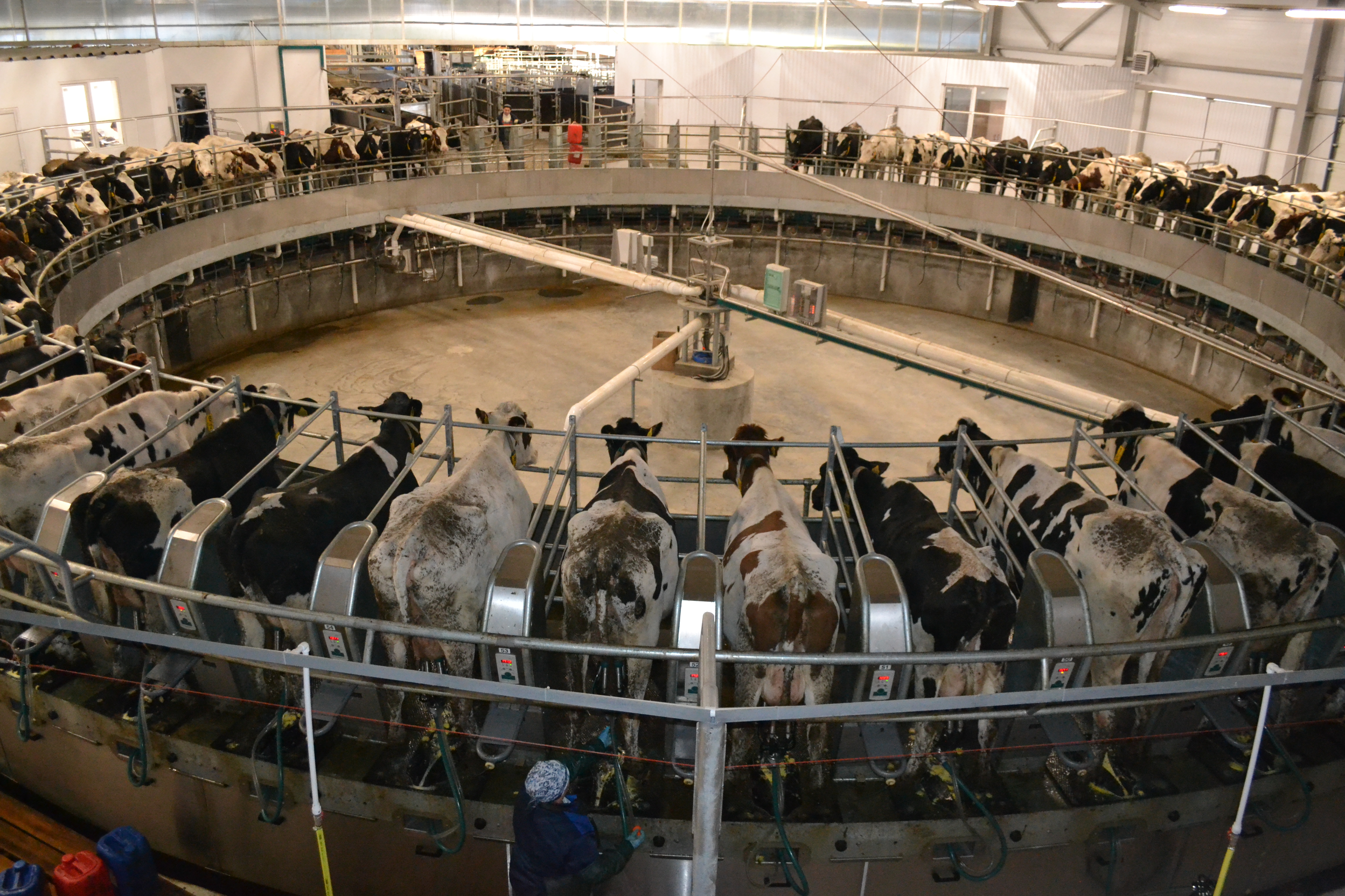 Далее школьникам была показана технология современного доения животных. Сейчас в комплексе содержится 1450 коров, но скоро их уже будет около 3250. Посещение доильного зала «Карусель» вызвало восторг не только у детей, но и у сопровождавших их взрослых. Практически все они бывали на традиционной колхозной ферме, видели, как проходит процесс доения животных, но современный комплекс превзошел все ожидания.Вращающаяся платформа «Карусель», на которой животные находятся в процессе доения, произведена по новейшей технологии и разработана специально для больших поголовий. При этом уделено внимание комфорту животных при доении. На платформу «Карусели» помещается 72 коровы (в группе 150 животных). Обслуживают ее всего два человека, и в зале всегда поддерживается идеальная чистота.