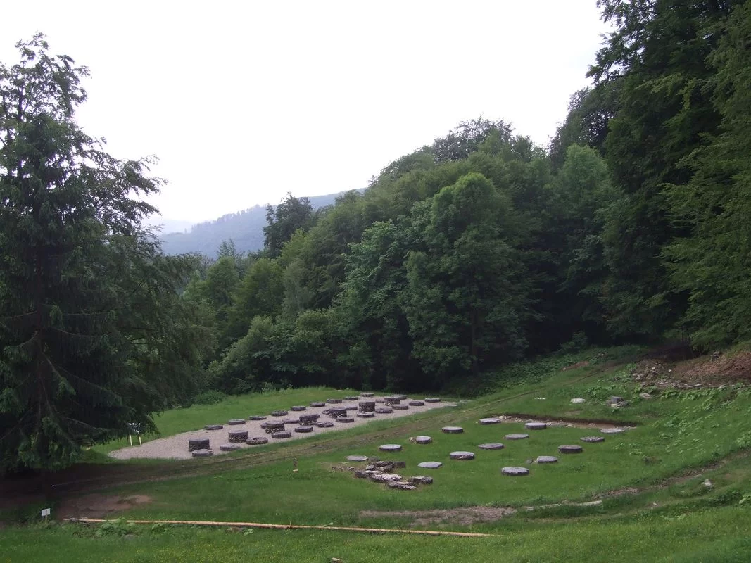 Лес расступается. Поднимаюсь на гребень горы, и передо мной, если спуститься на пару метров вниз, расстилается вытянутая, как футбольное поле, поляна. Тут и там лежат и стоят камни. Вдали – вкопанные в землю столбы; самые высокие – с человеческий рост, низкие – по колено. Они установлено скученно, очень близко друг к другу, высокие и низкие – вперемешку, среди них каменное кольцо, выложенное на земле. Еще дальше виден ровный круг – каменный солнечный диск, к которому ведет серая полоска камней, будто хвост ската. Что это? Святилище, каменные часы или календарь, то и другое вместе? В самых разных местах – то бесформенные груды камня, то аккуратно вбитые в землю сваи, прямоугольные, округлые, полуразрушенные и совершенно целые, всякие, они образуют ровный правильный квадрат. Если бы не камень, если бы не горная глушь, я бы подумал, что эти каменные круги – люки канализационных колодцев. «Люки» тянутся ровными линиями в несколько рядов. Их назначение тоже не слишком ясно, то ли фундамент для статуй, то ли основание алтарей (у каждого рода мог быть свой алтарь). Население Сармизегетузы жило в деревянных домах поблизости, а здесь располагался сакральный центр.