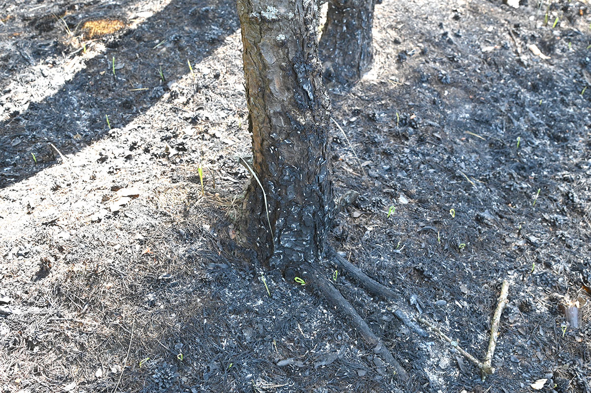Солнце жарит не по-майски. Под ногами рассыпается в труху лесная подстилка. Мы идем по черному пятну в сосняке прямо у села Корекозево, что в Перемышльском районе. Горело здесь на прошлой неделе. В будний день, сразу после майских праздников, когда народ уже закончил с шашлыками-пикниками и отправился на работу, такого никто не ожидал.
