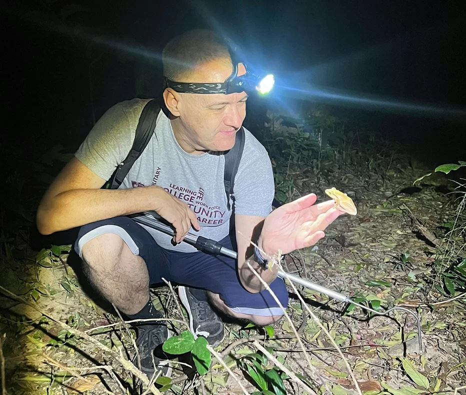 Для Виктора Чернова это была первая поездка в Юго-Восточную Азию. Одно дело слушать рассказы, смотреть фото и видео, совсем другое – идти по ночному тропическому лесу, слушать его звуки, вдыхать его запахи.– Чтобы найти геккона, надо стать гекконом. В экспедиции мы вели ночной образ жизни – днем спали, а в шесть вечера вставали и собирались на охоту. Ориентировались по звукам брачных песен амфибий и рептилий. Здорово было наблюдать в свете фонарика, как спят на деревьях ящерицы, ходят по земле плюшки-лягушки. Мне на глаза попалась паутинка с маленькими паучками. Поднимаю голову, а вверху паучья свадьба – в центре огромная самка-невеста, вокруг – крохотные женихи. Они кормятся остатками того, что она поймает. Но может и закусить зазевавшимся женихом, – описывал Виктор Чернов дикие лесные нравы.