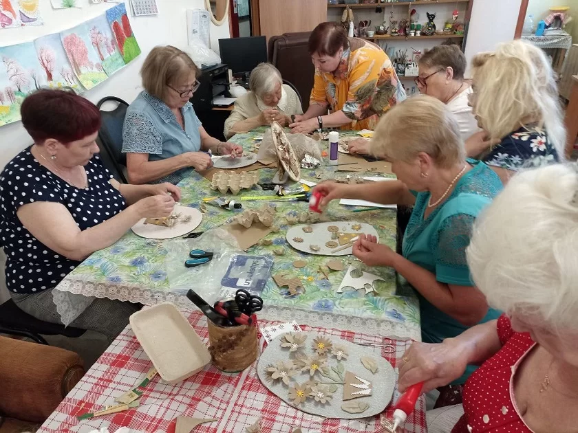 Участники клуба — активные и вдохновенные люди старшего поколения, которым от 60 до 90 лет. Они давно увлечены рукоделием и освоили уже более 12 различных техник. Сейчас они осваивают приёмы нового мастерства — картонажа. Это незаслуженно забытое старинное ремесло изготовления изящных вещиц из картона. Из него делают шкатулки, чайные домики, панно. Для этой техники нужны всего лишь картон, клей, ножницы.