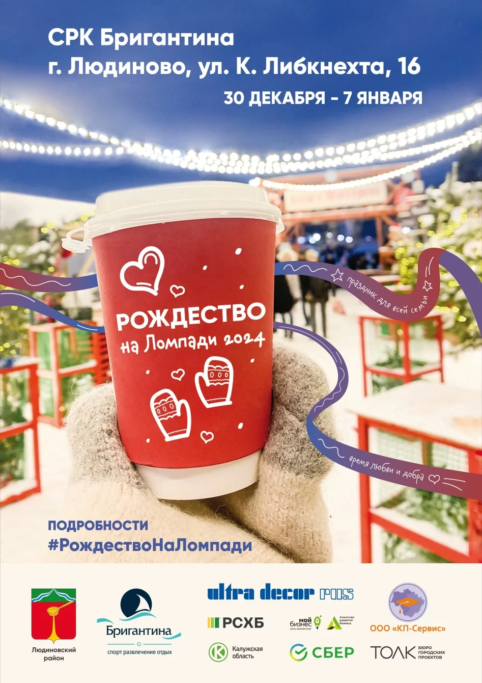 Праздничные мероприятия продлятся с 30 декабря по 7 января на площадке перед СРК «Бригантина» (г. Людиново, ул. К. Либкнехта, 16) и объединят в себе развлекательную, торговую, выставочную и фестивальную программы. Гостей ждет настоящая зимняя сказка: праздничные концерты, выступления музыкальных групп (Москва, Тула, Калужская область), детская и взрослая анимация, яркие фотозоны, спортивные соревнования, елка, Дед Мороз, сказочные персонажи и многое другое.