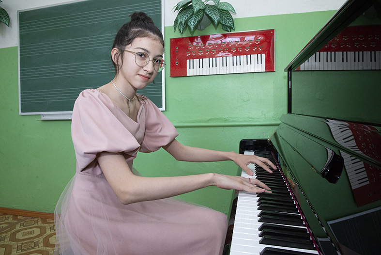 Несмотря на загруженность в обычной школе, старшеклассница совмещает фортепиано и сольное пение (вокалом с ней занимается Эльвира Клейменова). Руки музыканта по-настоящему волшебные, это они извлекают звук, почти паря над черно-белыми полосками клавиш... Предпочтение девушка отдает мелодичным вещам - «Вальс» фа-диез-минор А. Лядова, «Сонатина» Й. Гайдна, «Фантазия» И. С. Баха.