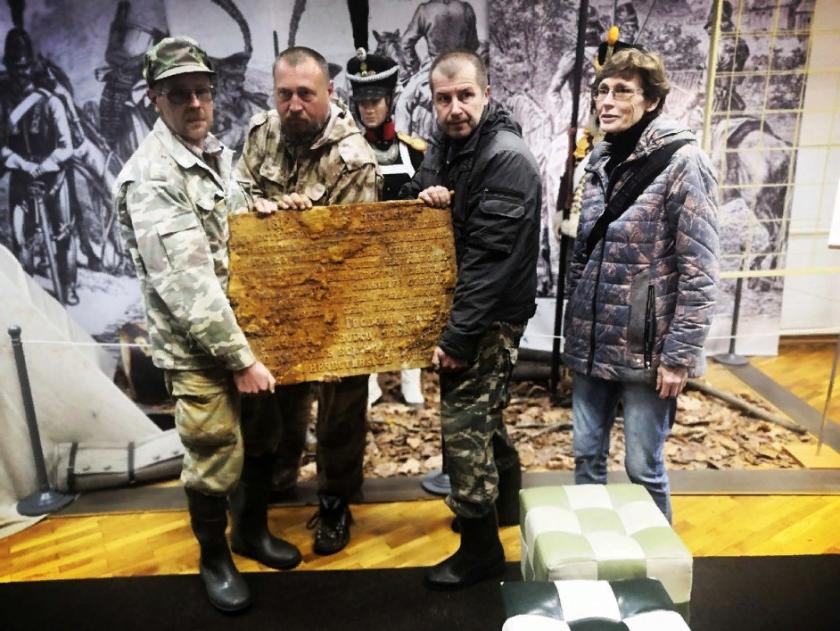 Вероятнее всего, найденная под Малоярославцем мемориальная плита когда-то была поставлена на месте будущего обелиска, заменив собой деревянный крест. По другой версии, это часть старого дореволюционного обелиска. Как артефакт попал в соседний район, остаётся загадкой. Сегодня исторически ценный объект передан Малоярославецкому музею 1812 года.