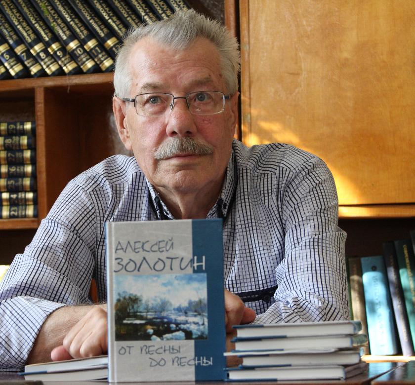 Много стихов Алексей Петрович посвятил своей малой родине, любимому и дорогому сердцу краю. Перемышль, Желохово, Сильково, река Ока, озеро Тишь, Толстова гора, Певкин бугор, Головнинский перекат... Эти географические названия стали заголовками его стихотворений. Строки Золотина напоены памятью о войне, посвящены жизни селян, а лирические стихи наполнены размышлениями о времени и своем месте в нем.Пою поля и перелески,
